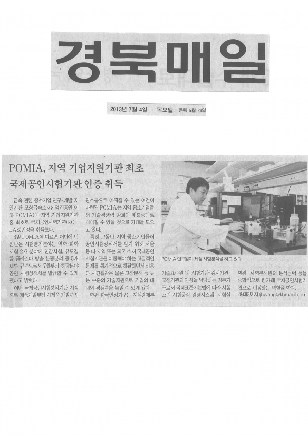 [경북매일] POMIA, 지역 기업지원기관 최초 국제공인시험기관 인증 취득